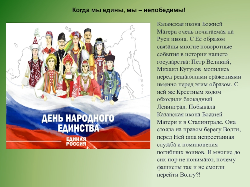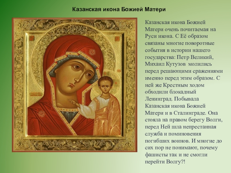 образом связаны многие поворотные события в истории нашего государства: Петр Великий, Михаил Кутузов молились перед решающими сражениями именно перед этим образом. С ней же Крестным ходом обходили блокадный Ленинград. Побывала Казанская икона Божией Матери и в Сталинграде. Она стояла на правом берегу Волги, перед Ней шла непрестанная служба и поминовения погибших воинов. И многие до сих пор не понимают, почему фашисты так и не смогли перейти Волгу?!