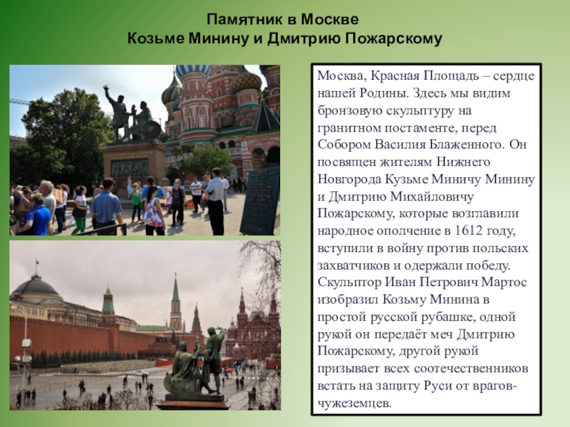 сердце нашей Родины. Здесь мы видим бронзовую скульптуру на гранитном постаменте, перед Собором Василия Блаженного. Он посвящен жителям Нижнего Новгорода Кузьме Миничу Минину и Дмитрию Михайловичу Пожарскому, которые возглавили народное ополчение в 1612 году, вступили в войну против польских захватчиков и одержали победу. Скульптор Иван Петрович Мартос изобразил Козьму Минина в простой русской рубашке, одной рукой он передаёт меч Дмитрию Пожарскому, другой рукой призывает всех соотечественников встать на защиту Руси от врагов-чужеземцев.