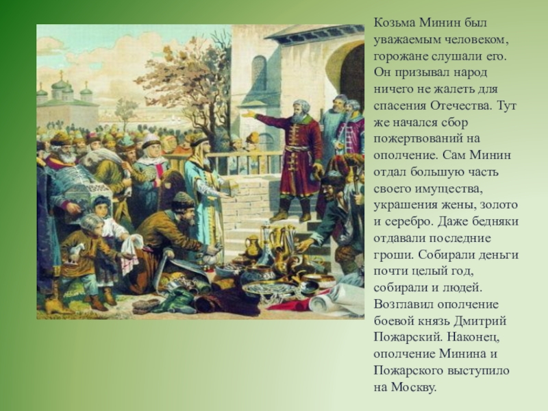 ничего не жалеть для спасения Отечества. Тут же начался сбор пожертвований на ополчение. Сам Минин отдал большую часть своего имущества, украшения жены, золото и серебро. Даже бедняки отдавали последние гроши. Собирали деньги почти целый год, собирали и людей. Возглавил ополчение боевой князь Дмитрий Пожарский. Наконец, ополчение Минина и Пожарского выступило на Москву.