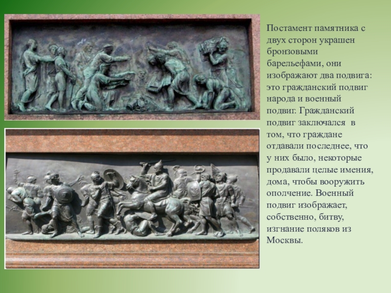 подвига: это гражданский подвиг народа и военный подвиг. Гражданский подвиг заключался в том, что граждане отдавали последнее, что у них было, некоторые продавали целые имения, дома, чтобы вооружить ополчение. Военный подвиг изображает, собственно, битву, изгнание поляков из Москвы.