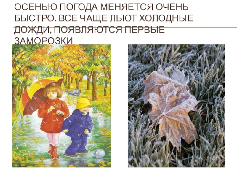 Слайд 3Осенью погода меняется очень быстро. Все чаще льют холодные дожди, появляются