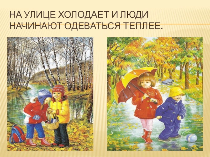 Слайд 6На улице холодает и люди начинают одеваться теплее.