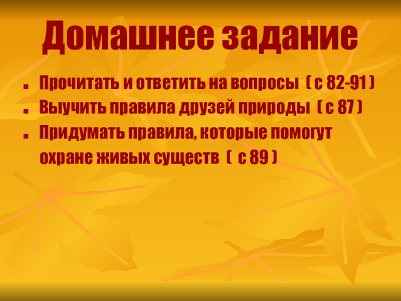 Домашнее заданиеПрочитать и ответить на вопросы ( с 82-91 )Выучить правила друзей природы ( с 87 )Придумать