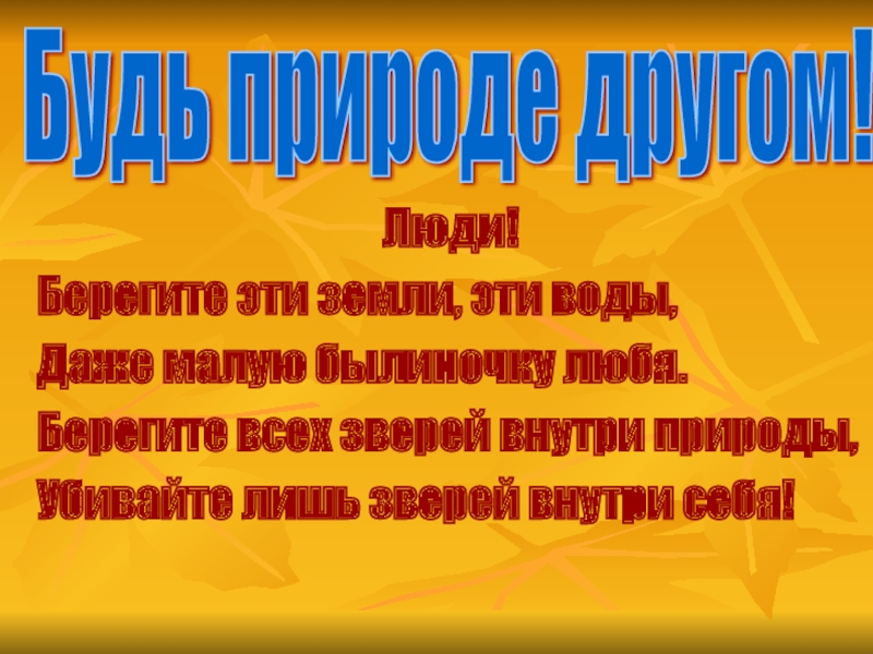 Будь природе другом! Люди!Берегите эти земли, эти воды,Даже малую былиночку любя.Берегите всех зверей внутри природы,Убивайте лишь зверей
