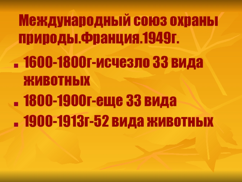 Международный союз охраны природы.Франция.1949г.1600-1800г-исчезло 33 вида животных1800-1900г-еще 33 вида1900-1913г-52 вида животных