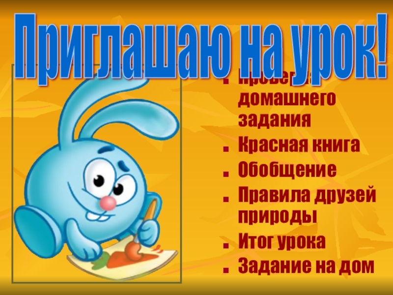 Проверка домашнего заданияКрасная книгаОбобщениеПравила друзей природыИтог урокаЗадание на домПриглашаю на урок!