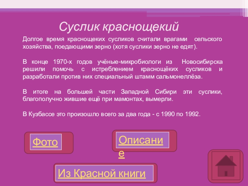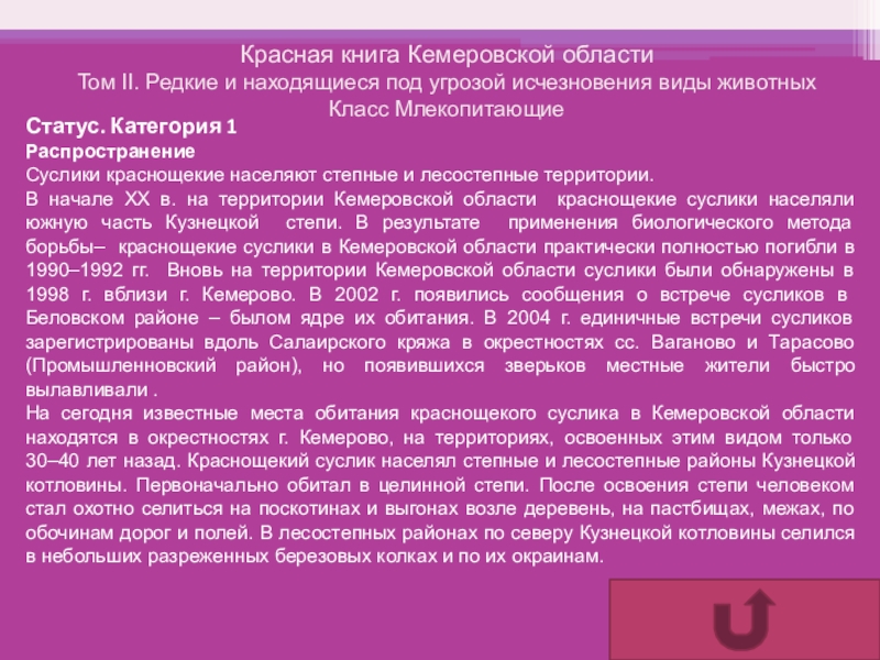 В начале XX в. на территории Кемеровской области краснощекие суслики населяли южную часть Кузнецкой степи. В результате применения биологического метода борьбы– краснощекие суслики в Кемеровской области практически полностью погибли в 1990‒1992 гг. Вновь на территории Кемеровской области суслики были обнаружены в 1998 г. вблизи г. Кемерово. В 2002 г. появились сообщения о встрече сусликов в Беловском районе – былом ядре их обитания. В 2004 г. единичные встречи сусликов зарегистрированы вдоль Салаирского кряжа в окрестностях сс. Ваганово и Тарасово (Промышленновский район), но появившихся зверьков местные жители быстро вылавливали .