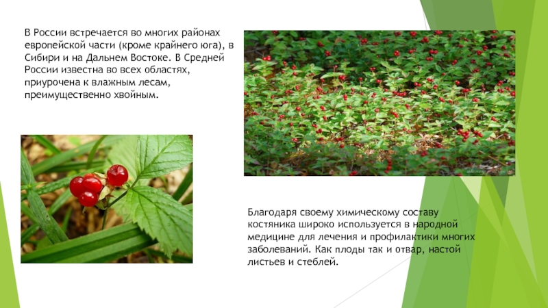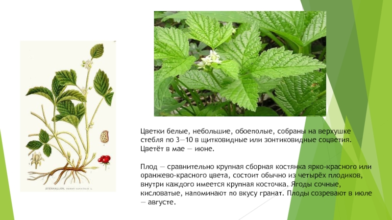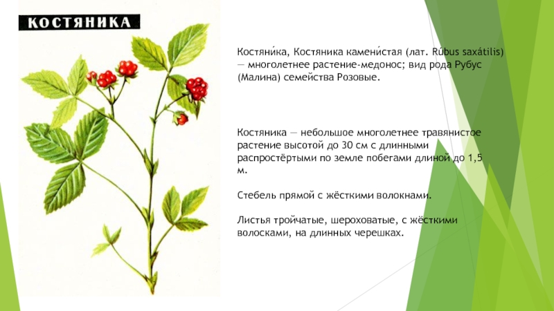 Костяника — небольшое многолетнее травянистое растение высотой до 30 см с длинными распростёртыми по земле побегами длиной до 1,5 м.