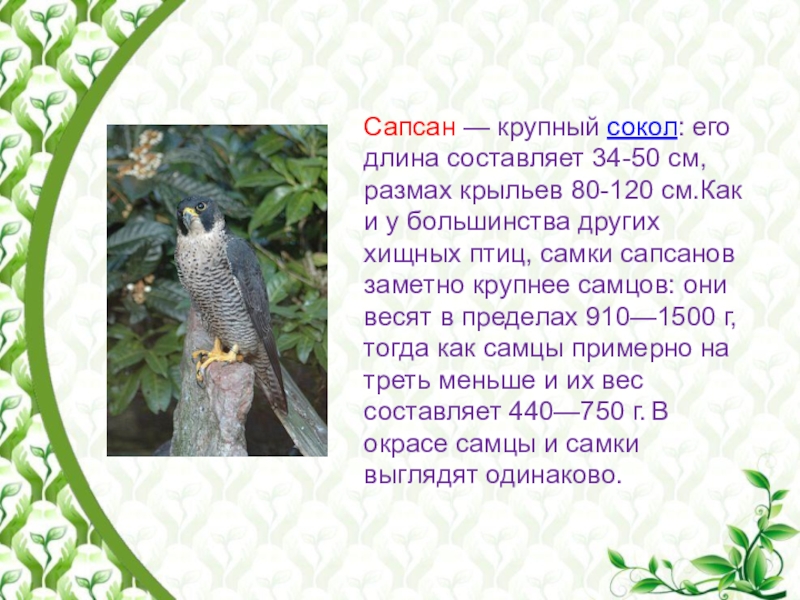 Слайд 17Сапсан — крупный сокол: его длина составляет 34-50 см, размах крыльев 80-120 см.Как и