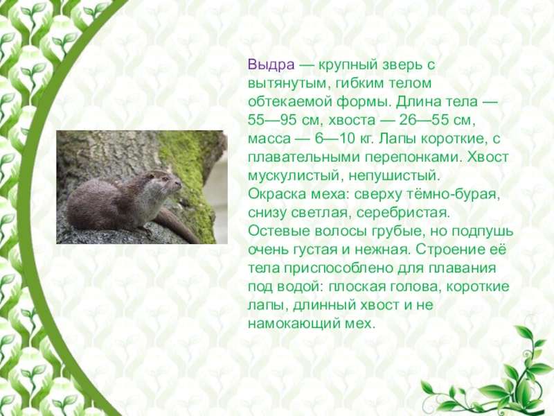 Слайд 14Выдра — крупный зверь с вытянутым, гибким телом обтекаемой формы. Длина тела —