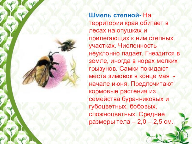 Слайд 13Шмель степной- На территории края обитает в лесах на опушках и