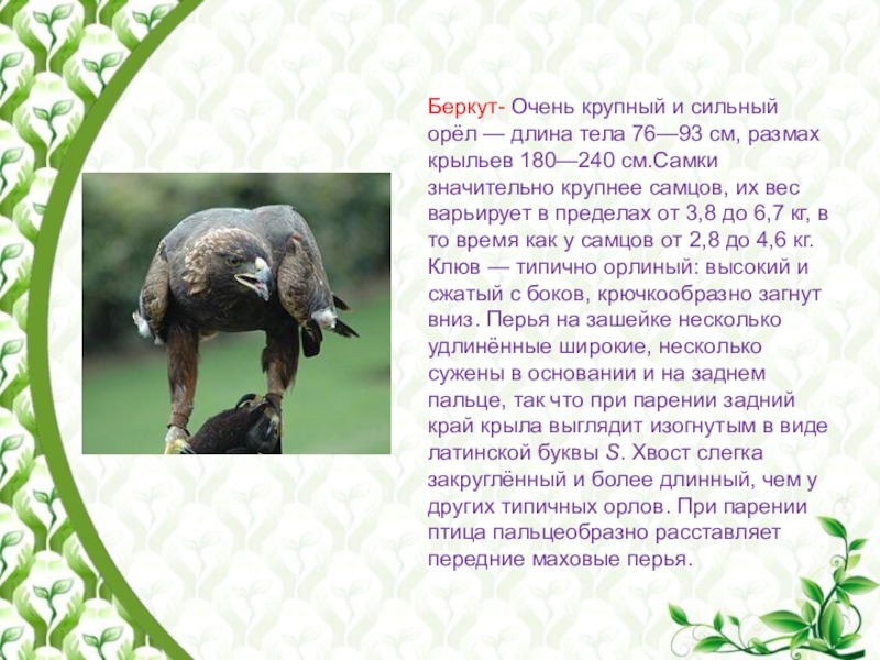 Слайд 16Беркут- Очень крупный и сильный орёл — длина тела 76—93 см, размах крыльев
