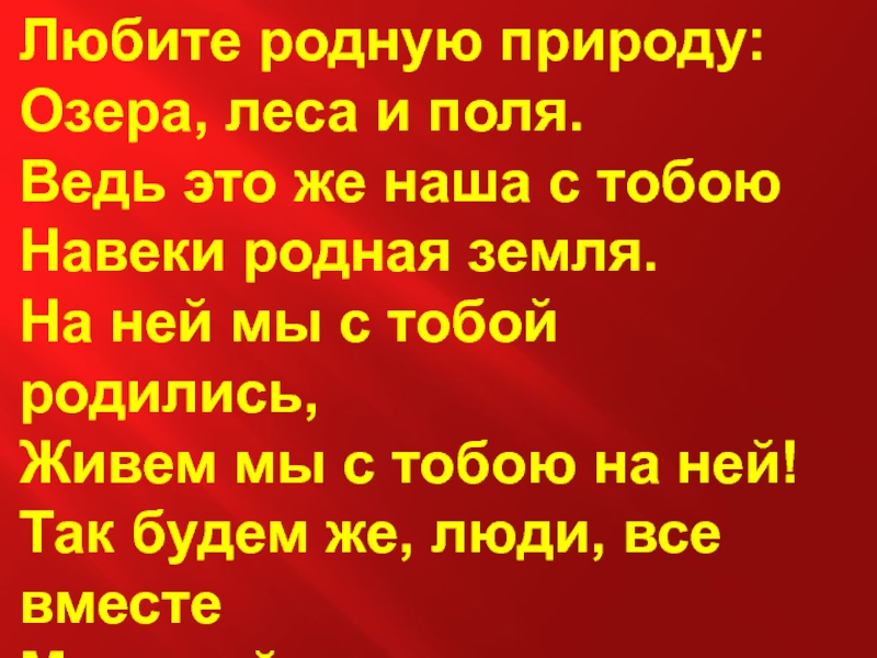 Любите родную природу:  Озера, леса и поля.  Ведь это же наша с тобою  Навеки родная земля.  На