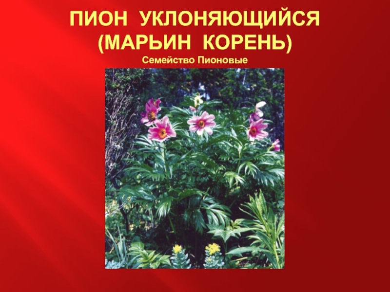 Слайд 39ПИОН УКЛОНЯЮЩИЙСЯ (МАРЬИН КОРЕНЬ) Семейство Пионовые