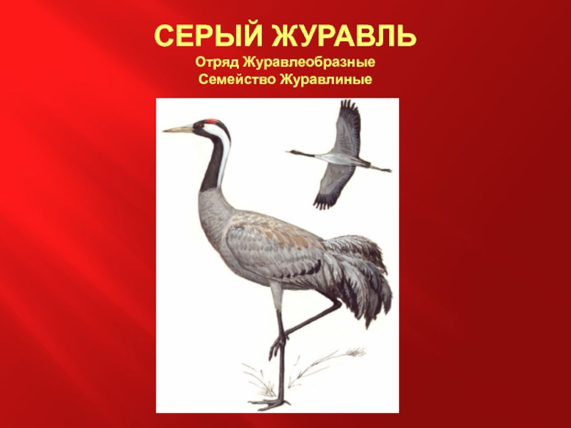 Слайд 15 СЕРЫЙ ЖУРАВЛЬ Отряд Журавлеобразные Семейство Журавлиные