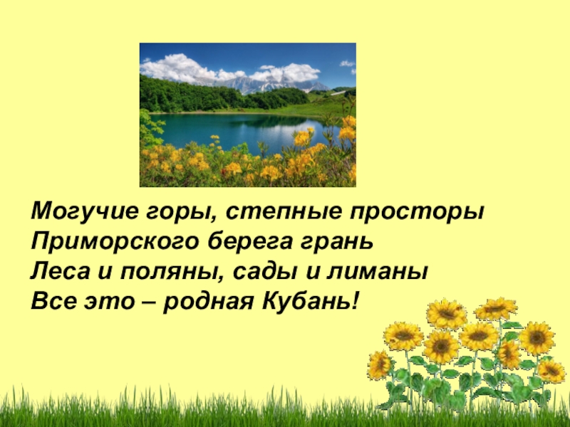 Могучие горы, степные просторы Приморского берега грань Леса и поляны, сады и лиманы Все это – родная Кубань!