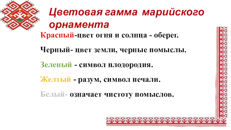 Цветовая гамма марийского орнаментаКрасный-цвет огня и солнца - оберег.Черный- цвет земли, черные помыслы.Зеленый - символ плодородия. Желтый