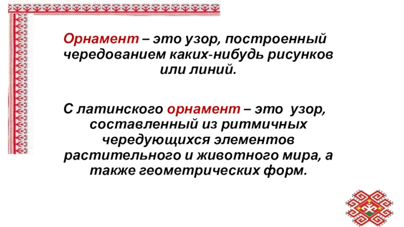 Орнамент – это узор, построенный чередованием каких-нибудь рисунков или линий. С латинского орнамент – это узор, составленный