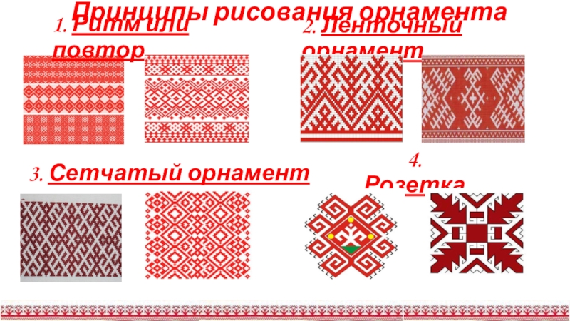 Принципы рисования орнамента  1. Ритм или повтор 2. Ленточный орнамент 3. Сетчатый орнамент 4. Розетка