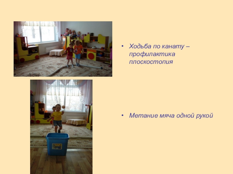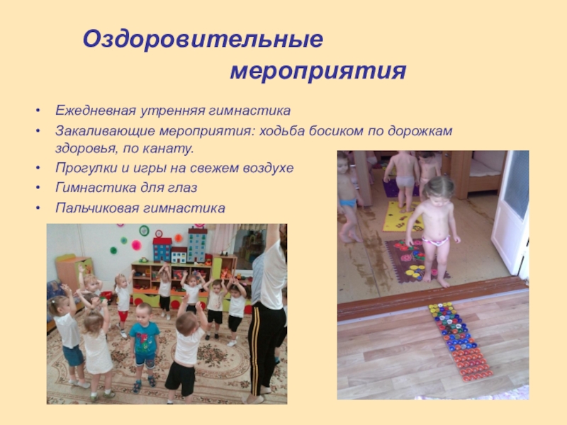 Закаливающие мероприятия: ходьба босиком по дорожкам здоровья, по канату.