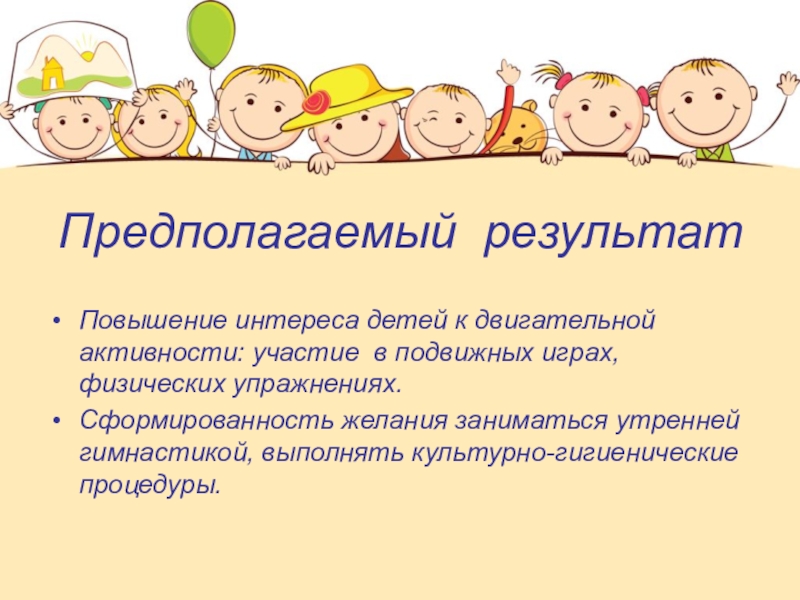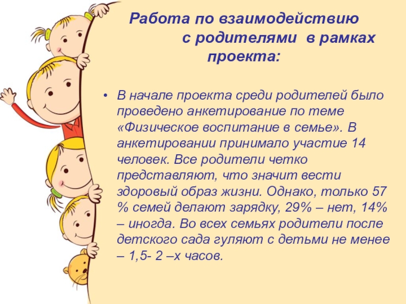В начале проекта среди родителей было проведено анкетирование по теме «Физическое воспитание в семье». В анкетировании принимало участие 14 человек. Все родители четко представляют, что значит вести здоровый образ жизни. Однако, только 57 % семей делают зарядку, 29% – нет, 14% – иногда. Во всех семьях родители после детского сада гуляют с детьми не менее – 1,5- 2 –х часов.