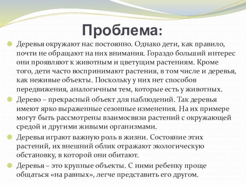 обращают на них внимания. Гораздо больший интерес они проявляют к животным и цветущим растениям. Кроме того, дети часто воспринимают растения, в том числе и деревья, как неживые объекты. Поскольку у них нет способов передвижения, аналогичным тем, которые есть у животных.