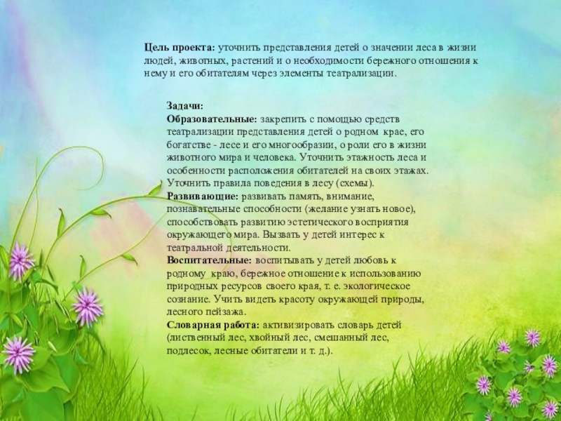 Образовательные: закрепить с помощью средств театрализации представления детей о родном крае, его богатстве - лесе и его многообразии, о роли его в жизни животного мира и человека. Уточнить этажность леса и особенности расположения обитателей на своих этажах. Уточнить правила поведения в лесу (схемы).