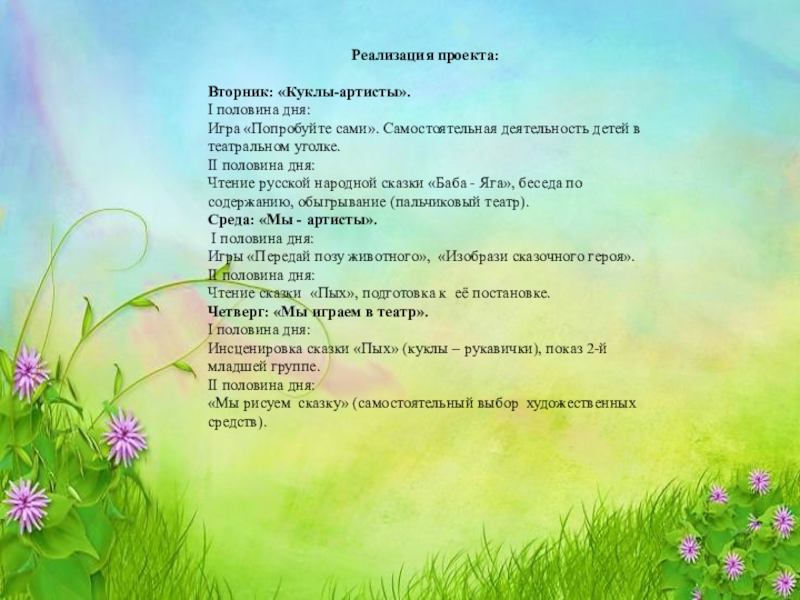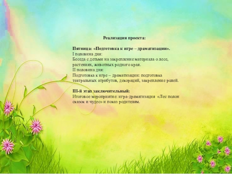 Беседы о лесе, растениях, животных родного края; («Зачем люди ходят в лес?», «Знакомство с трудом лесника», «Лесные жители» и др.); рассматривание картин и иллюстраций о лесе («Лес в разное время года»); чтение художественной литературы (В. Зотов «Лиственница», «Рябина», С. Есенин «Берёзка», А. Блок «Зайчик», Э. Блайтон «Что такое лес?», М. Пришвин «Листопад» и др.); загадки, пословицы и поговорки, народные приметы, чтение русских народных сказок; изготовление атрибутов и декораций, распределение ролей (Ёж, Баба – Яга) и подбор костюмов и др.