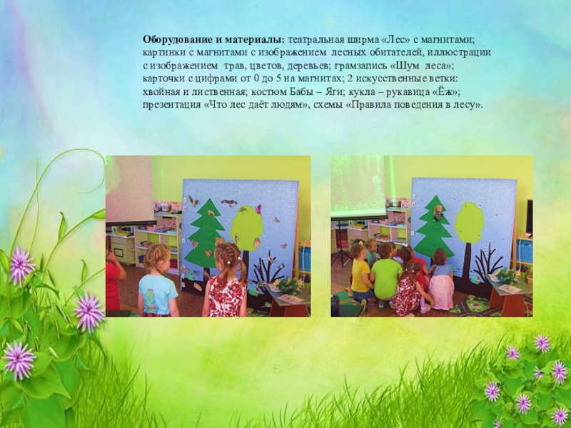 Словарная работа: активизировать словарь детей (лиственный лес, хвойный лес, смешанный лес, подлесок, лесные обитатели и т. д.).