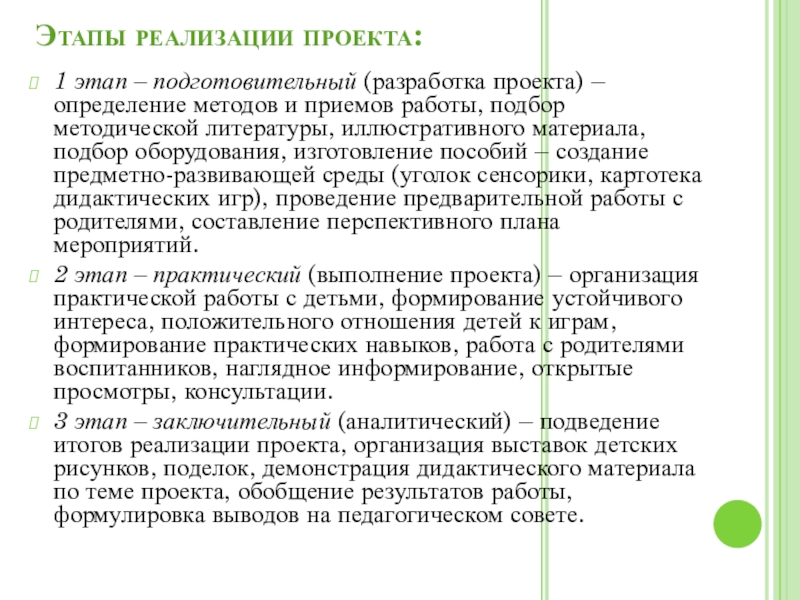 3 этап – заключительный (аналитический) – подведение итогов реализации проекта, организация выставок детских рисунков, поделок, демонстрация дидактического материала по теме проекта, обобщение результатов работы, формулировка выводов на педагогическом совете.