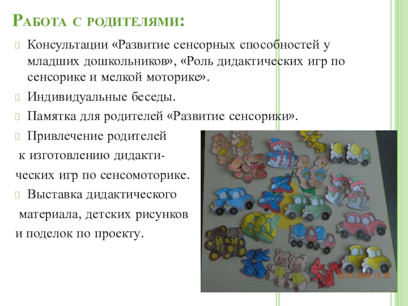 и приемов работы, подбор методической литературы, иллюстративного материала, подбор оборудования, изготовление пособий – создание предметно-развивающей среды (уголок сенсорики, картотека дидактических игр), проведение предварительной работы с родителями, составление перспективного плана мероприятий.