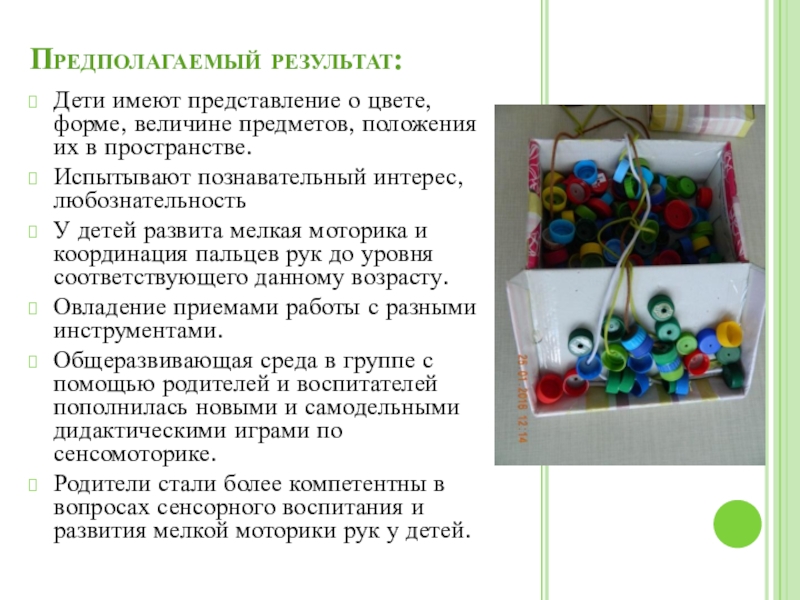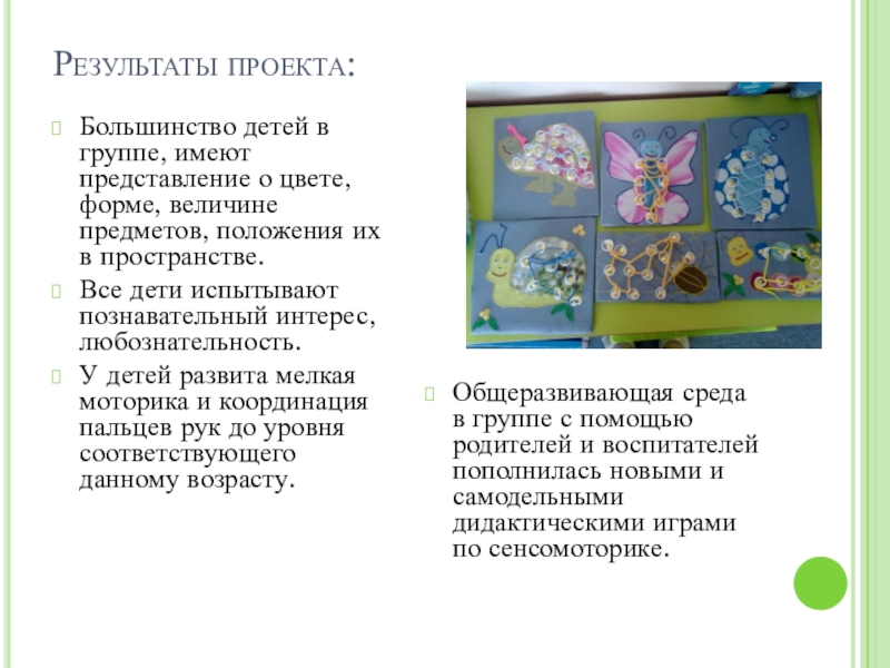 Общеразвивающая среда в группе с помощью родителей и воспитателей пополнилась новыми и самодельными дидактическими играми по сенсомоторике.