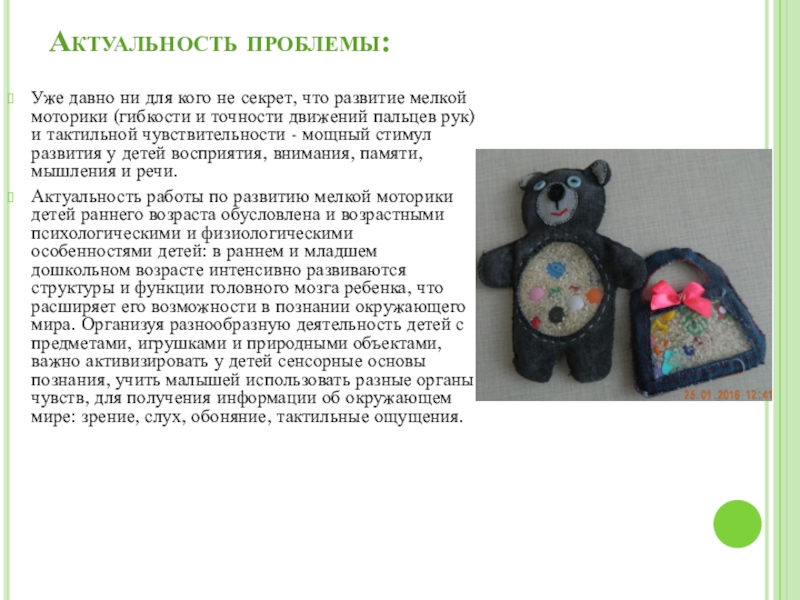 Актуальность работы по развитию мелкой моторики детей раннего возраста обусловлена и возрастными психологическими и физиологическими особенностями детей: в раннем и младшем дошкольном возрасте интенсивно развиваются структуры и функции головного мозга ребенка, что расширяет его возможности в познании окружающего мира. Организуя разнообразную деятельность детей с предметами, игрушками и природными объектами, важно активизировать у детей сенсорные основы познания, учить малышей использовать разные органы чувств, для получения информации об окружающем мире: зрение, слух, обоняние, тактильные ощущения.