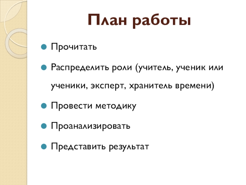 План работыПрочитатьРаспределить роли (учитель, ученик или ученики, эксперт, хранитель времени)Провести методикуПроанализироватьПредставить результат