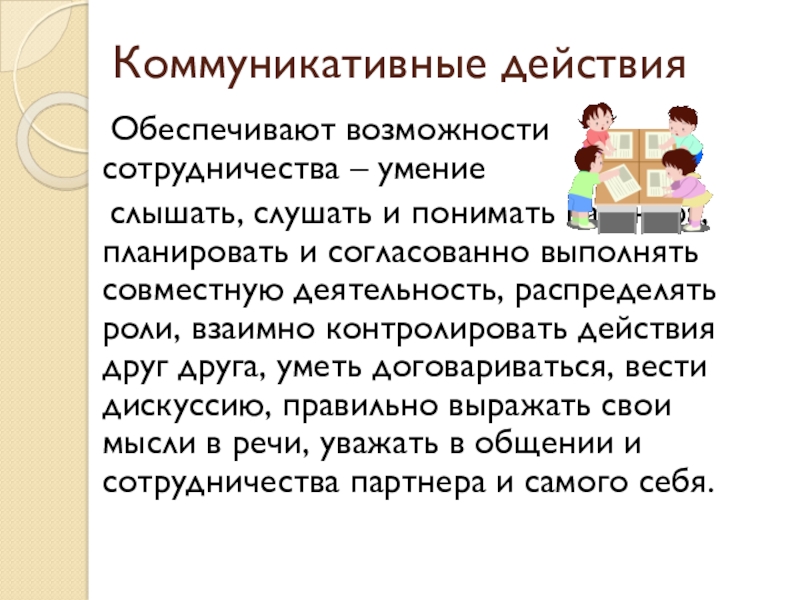 Коммуникативные действия	Обеспечивают возможности сотрудничества – умение 	слышать, слушать и понимать партнера, планировать и согласованно выполнять совместную деятельность,
