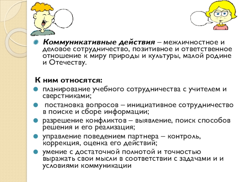 Коммуникативные действия – межличностное и деловое сотрудничество, позитивное и ответственное отношение к миру природы и культуры, малой