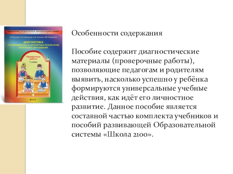 выявить, насколько успешно у ребёнка формируются универсальные учебные действия, как идёт его личностное развитие. Данное пособие является составной частью комплекта учебников и пособий развивающей Образовательной системы «Школа 2100».