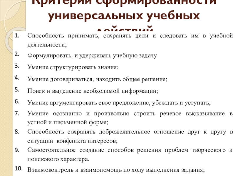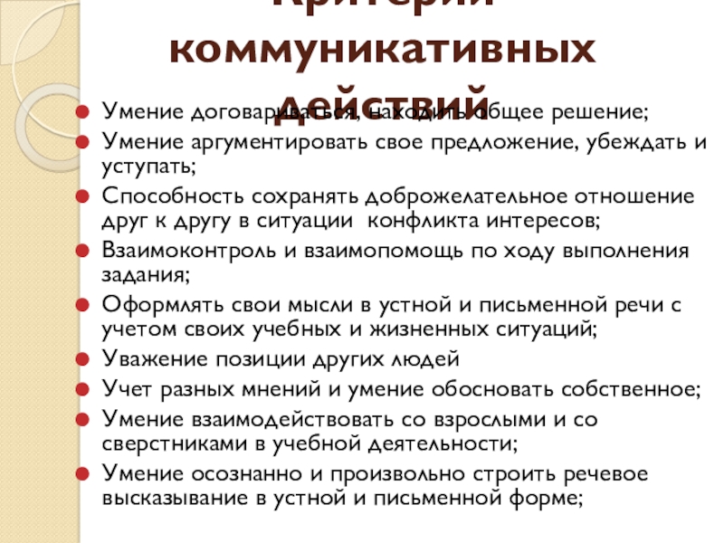 Критерии коммуникативных действийУмение договариваться, находить общее решение;Умение аргументировать свое предложение, убеждать и уступать;Способность сохранять доброжелательное отношение друг