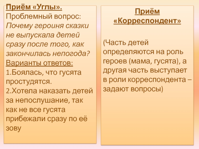 (Часть детей определяются на роль героев (мама, гусята), а другая часть выступает в роли корреспондента – задают вопросы)