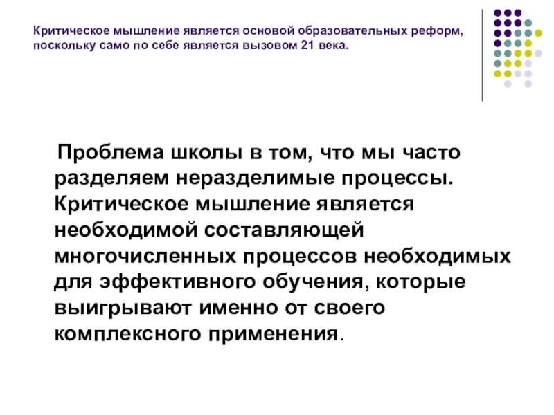 Проблема школы в том, что мы часто разделяем неразделимые процессы. Критическое мышление является необходимой составляющей многочисленных процессов необходимых для эффективного обучения, которые выигрывают именно от своего комплексного применения.