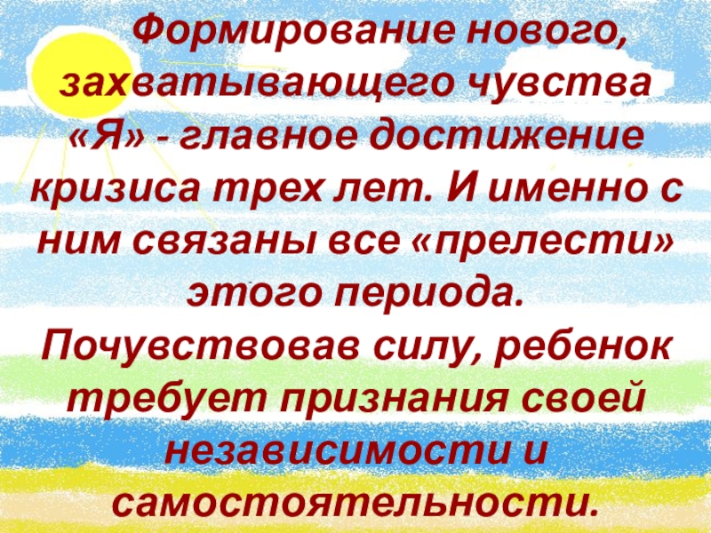 - главное достижение кризиса трех лет. И именно с ним связаны все «прелести» этого периода. Почувствовав силу, ребенок требует признания своей независимости и самостоятельности.