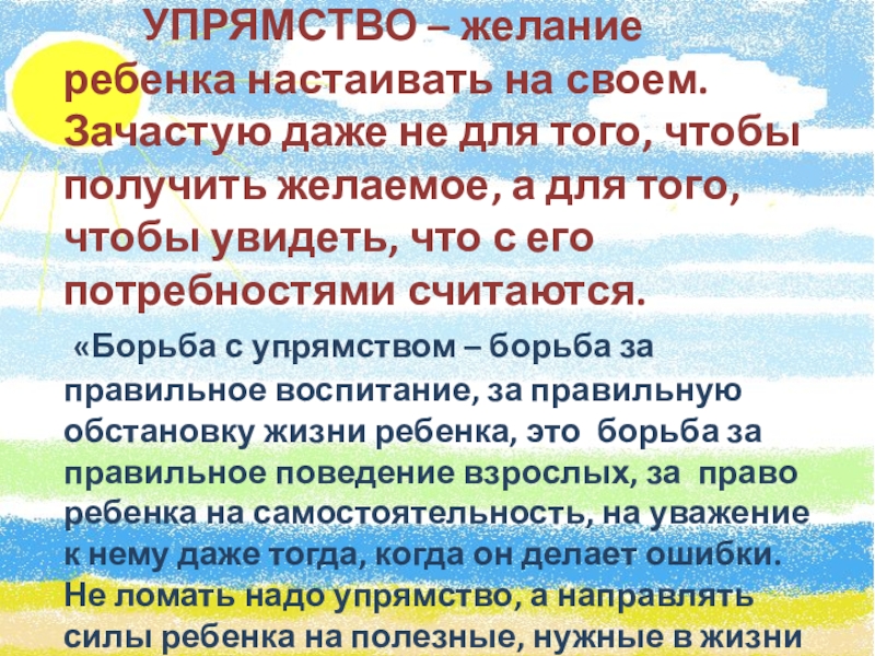 «Борьба с упрямством – борьба за правильное воспитание, за правильную обстановку жизни ребенка, это борьба за правильное поведение взрослых, за право ребенка на самостоятельность, на уважение к нему даже тогда, когда он делает ошибки. Не ломать надо упрямство, а направлять силы ребенка на полезные, нужные в жизни цели». Е.А. Аркин
