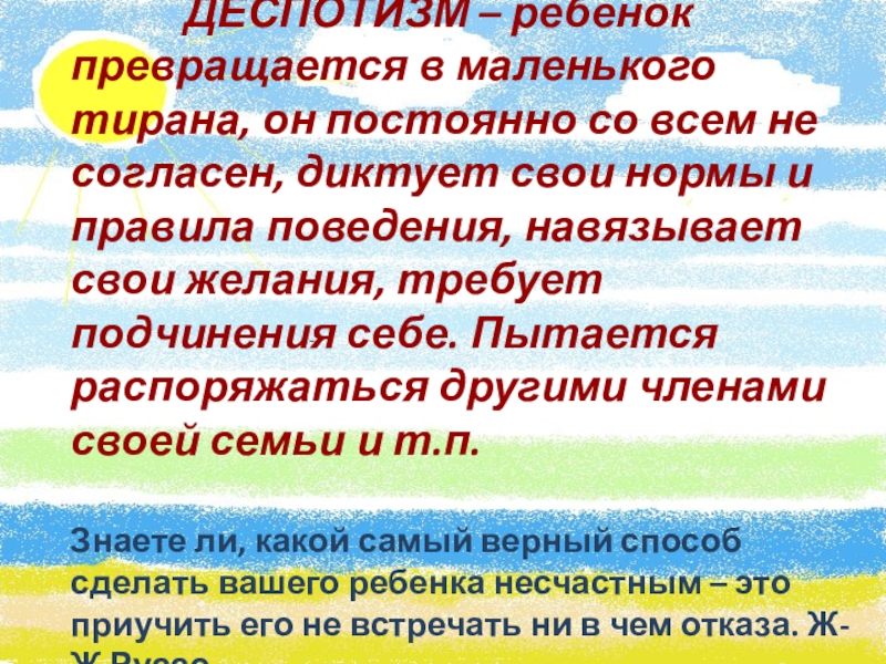 Слайд 14 ДЕСПОТИЗМ – ребенок превращается в маленького тирана,