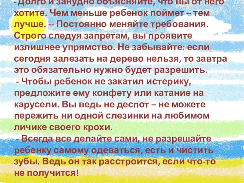 - Будьте всегда строги и даже суровы: ругайте каждую минуту, посильнее шлепайте, наказывайте даже с целью профилактики, при любом удобном случае подчеркивайте свое превосходство, критикуйте за неудачи и противодействуйте во всем с целью мести.