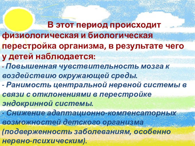В этот период происходит физиологическая и биологическая перестройка организма, в результате чего у детей наблюдается: