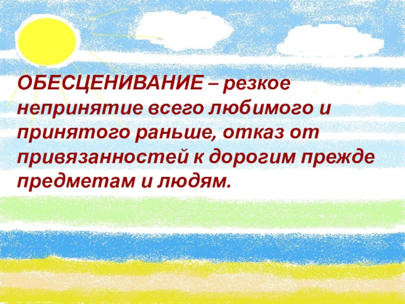 Слайд 12ОБЕСЦЕНИВАНИЕ – резкое непринятие всего любимого и принятого раньше, отказ от
