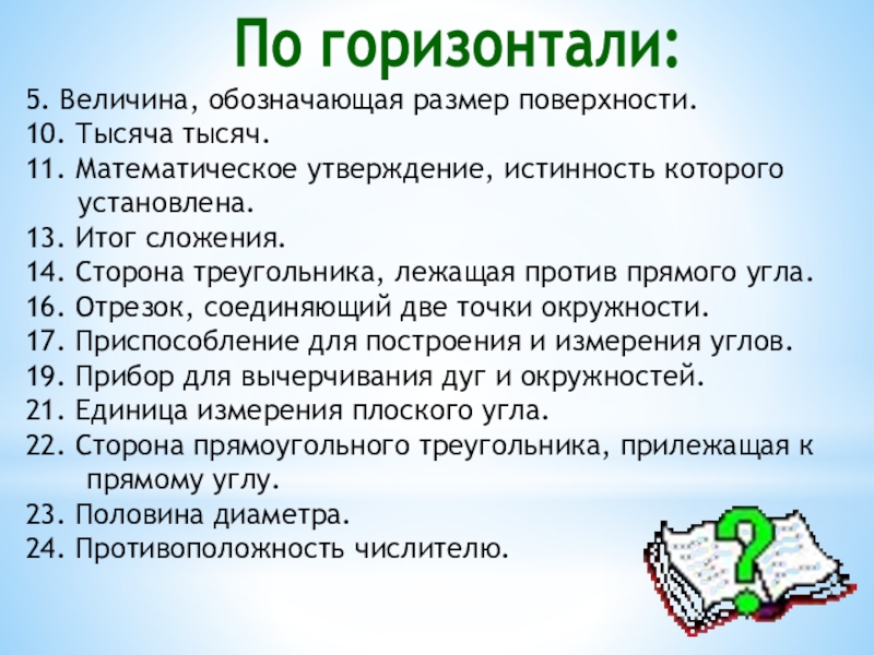5.Площадь, 10.Миллион, 11.Теорема, 13.Сумма, 14.Гипотенуза, 16.Хорда, 17.Транспортир, 19.Циркуль, 21.Градус, 22.Катет, 23.Радиус, 24.Знаменатель