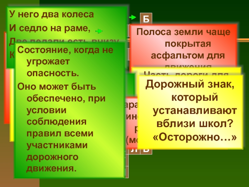 БЕЗОПАСНОСТЬОИДВТЕЛИТДТЕЛЕФНРАУТОРДАГОРВЕЛОДЕПИРОФСВЕТПХОДЕШЧеловек, находящийся вне транспортного средства, участник движенияТехническое средство, регулирующее дорожное движение на перекрёсткеУ него два колеса И седло на раме, Две педали есть внизуКрутят их ногами.Полоса земли чаще покрытая асфальтом для движения транспортных средствЧасть дороги для