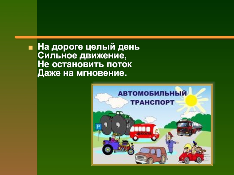 Слайд 4На дороге целый день Сильное движение, Не остановить поток Даже на мгновение.