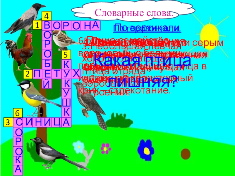 6.Птица семейства вороновых, с белыми перьями в крыльях, издающая характерный крик – стрекотание.